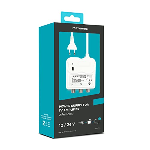 METRONIC 332170 Amplificateur d'Intérieur avec Réglage de Gain, 2 Sorties TV 9,52 mm - Alimentation 12/24V pour ampli TV - Alimentation Secteur - Blanc