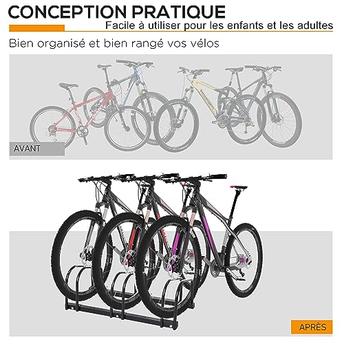 HOMCOM Râtelier 3 vélos range-vélos support de rangement pneu 65 mm sol ou mural pour VTT enfants BMX 76 x 33 x 27 cm acier noir