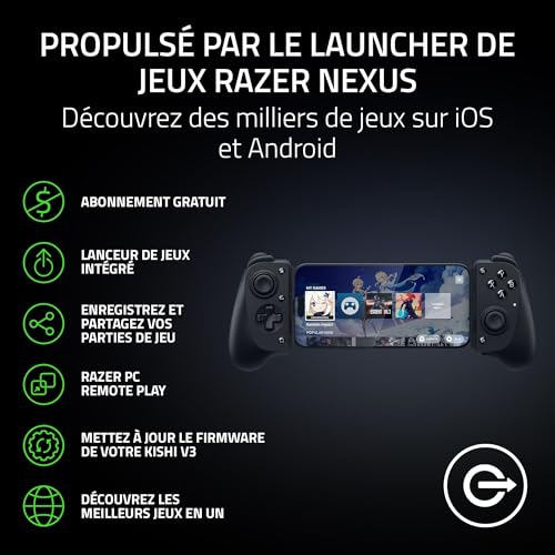 Razer Kishi V3 - Contrôleur mobile de taille normale pour iPhone et smartphones Android - USB-C - sticks analogiques anti-dérive - 12 boutons (Sensa HD Haptics, Nexus Game Launcher) Noir