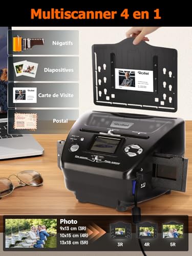 | pièces incluses | Scanner, 1 support pour négatifs, 1 support pour diapositives, 3 supports pour photos - 1 par taille 9x13, 10x15, 13x18 , Câble USB, Adaptateur secteur USB, Logiciel de numérisation |
