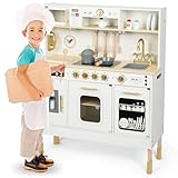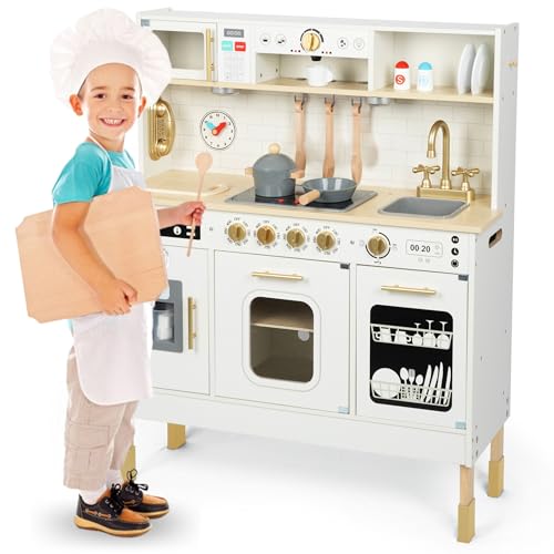 Mamabrum Cuisine Enfant en Bois Interactive LED - Hauteur Réglable 88-104cm avec Micro-Ondes, Lave-Vaisselle, Machine à Café et 15 Accessoires