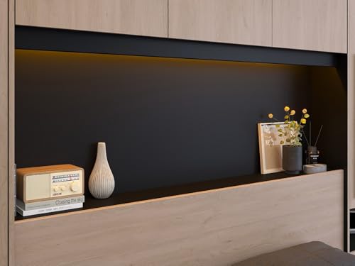 Lit pont 160 x 200 cm avec rangements - Avec LEDs - Coloris : Naturel et noir + Sommier + Matelas - VELONA