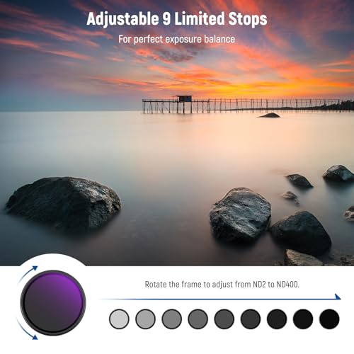 NEEWER 67mm Filtre ND Variable ND2-ND400, Filtre à Densité Neutre Réglable à Arrêt Dur Limité avec Verre Optique Multicouche Hydrofuge Résistant aux Rayures, Cadre Mince en Aluminium